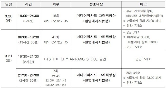 서울시는 이날부터 방탄소년단(BTS)의 컴백쇼 당일인 21일 자정까지 광화문 주변 10곳의 대형 옥외전광판을 통해 멤버 전원이 출연하는 영상을 세계 최초로 공개한다고 밝혔다.