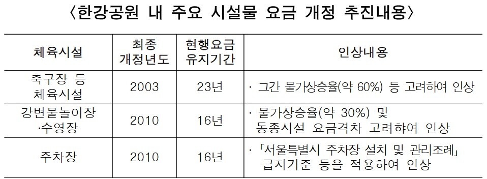 [도시경제채널 = 윤현중 기자] 서울시가 한강공원 내 주차장을 비롯해 야구장, 축구장, 수영장, 물놀이장 등 주요 시설물의 이용요금을 인상하는 방안을 추진한다. 시는 30일 ‘서울시 한강공원 보전 및 이용에 관한 기본 조례’ 개정안을 입법예고하고 내달 10일까지 시민 의견을 수렴한다고 밝혔다. 이번 개정안은 최대 15~20년간 동결돼온 요금을 물가 상승과 운영비 증가에 맞게 현실화하는 것이 핵심이다.