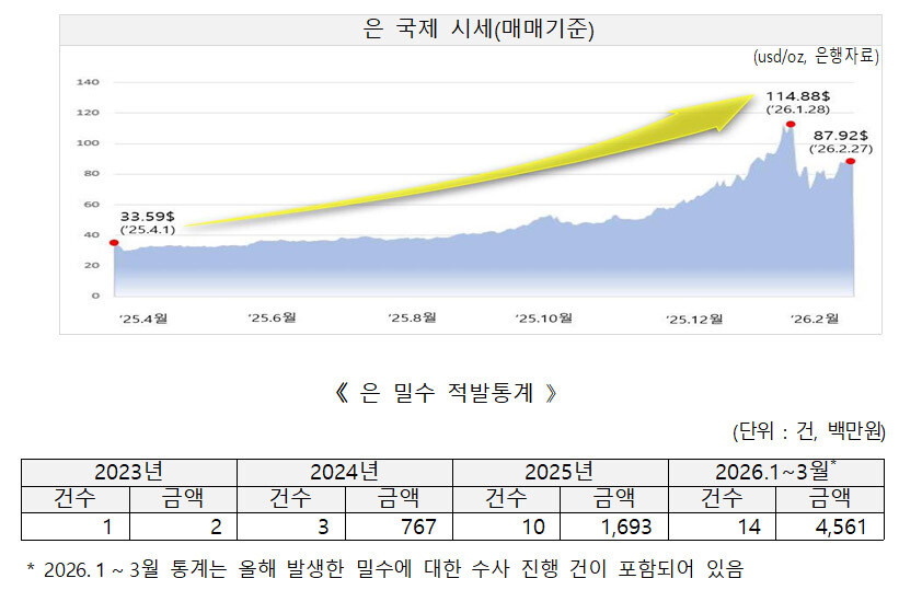 이 같은 가격 상승은 밀수 범죄 유인을 크게 키웠다. 은을 밀수할 경우 관세(3%)와 부가가치세(10%)를 회피할 수 있어 범죄 수익이 크게 증가하기 때문에 실제로 올해 1분기 은 밀수 적발액은 이미 지난해 전체 실적을 크게 웃돈 것으로 나타났다.