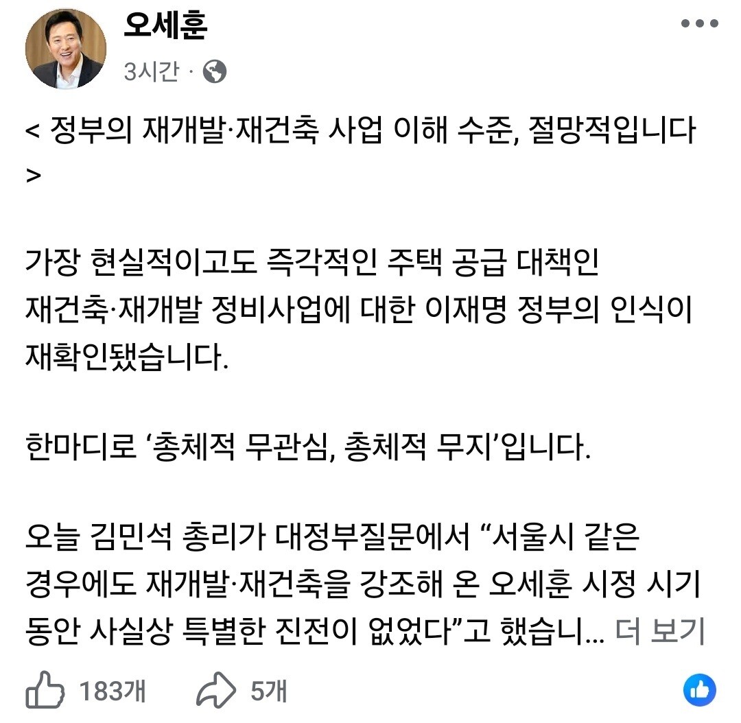 오 시장은 곧바로 페이스북을 통해 “정부의 재개발·재건축 사업 이해 수준은 절망적”이라며 “총체적 무관심, 총체적 무지”라고 반박했다. 그는 김 총리의 지역구인 영등포구 내 정비사업 사례를 직접 언급하며 “대교아파트, 신길2구역 등은 이미 사업시행인가가 완료됐다”고 반박했다.
