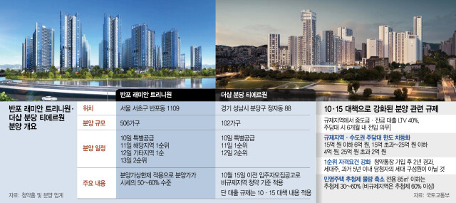 9일 분양업계에 따르면 경기 성남시 분당구 ‘더샵 분당티에르원’과 서울 서초구 ‘반포 래미안 트리니원’이 10일 특별공급을 시작으로 청약 일정에 들어간다. 정부가 지난달 16일 서울 25개 자치구와 경기 12개 지역(과천·광명·성남 분당·수정·중원구·안양 동안구 등)을 조정대상지역 및 투기과열지구로 지정한 이후 규제지역 분양은 이번이 처음이다.