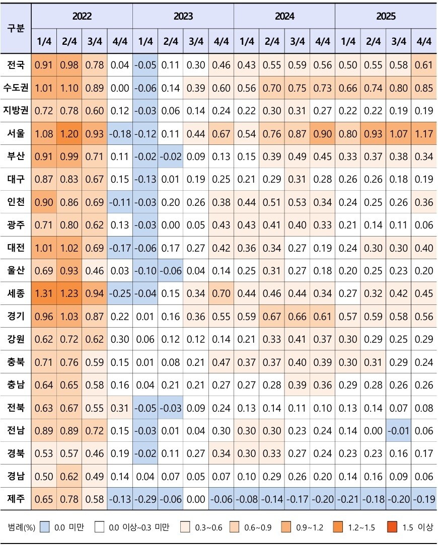 지역별로는 수도권이 3.08% 올라 전년(2.77%)보다 상승폭이 커진 반면, 지방권은 0.82%로 전년(1.10%)보다 낮아졌다. 서울은 4.02%, 경기는 2.32%로 전국 평균을 상회했으며, 지방은 대부분 2% 미만의 상승률에 머물렀다. 인구감소지역으로 지정된 89개 시군구의 지가변동률은 0.63%에 그쳐 비대상지역(2.39%)과 큰 차이를 보였다.