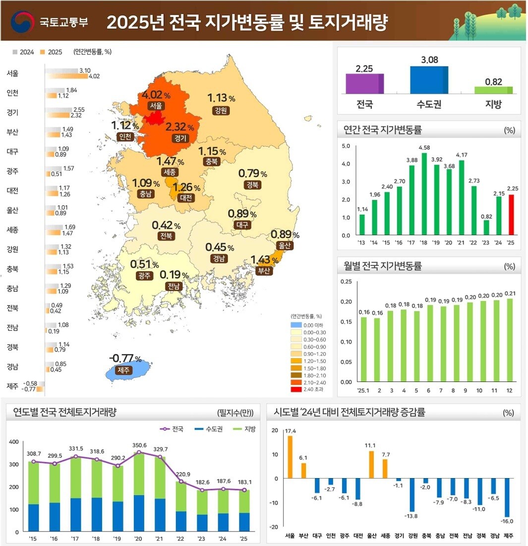 국토교통부와 한국부동산원이 26일 발표한 ‘2025년 연간 지가변동률 및 토지거래량’에 따르면 전국 지가는 2024년(2.15%)보다 0.10%포인트, 2023년(0.82%)보다 1.43%포인트 높은 2.25% 상승했다. 전국 지가는 2023년 3월 이후 34개월 연속 오름세를 이어갔으며, 지난해 하반기부터는 상승폭이 확대되는 흐름을 보였다.