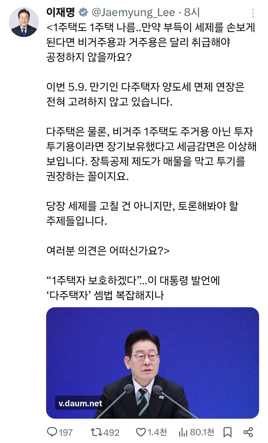 [도시경제채널 = 윤문용 기자] 이재명 대통령이 23일 새벽 소셜미디어서비스 X(구 트위터)를 통해 “1주택도 거주용과 비거주용을 달리 취급해야 공정하다”며 “5월 9일 만기인 다주택자 양도세 면제 연장은 전혀 고려하지 않고 있다”고 밝혔다.