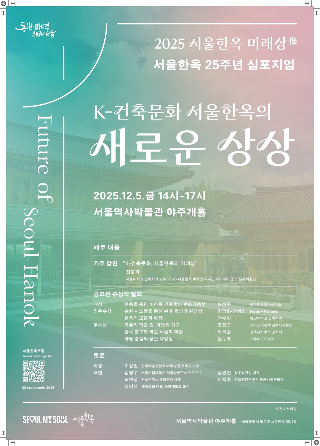 이어 이강민 한국예술종합학교 교수를 좌장으로 서울시립대, 국가한옥센터, 건축연구소, 건설업계 전문가들이 참여하는 종합토론이 열려 서울한옥의 미래상을 다각도로 논의한다. 이날 행사에서는 공모전 시상식도 함께 진행되며, 총 13점의 수상작이 특별 전시된다.
