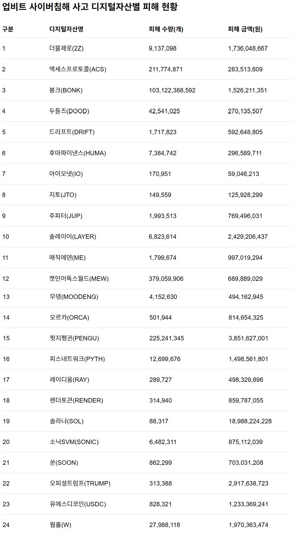자료에 따르면 해킹은 27일 오전 4시 42분에 시작돼 5시 36분에 완료됐다. 이 짧은 시간 동안 초당 약 3212만개, 금액으로는 1373만 원 상당의 코인이 빠져나갔다. 피해 규모는 회원 자산 약 386억원, 회사 자산 약 59억원으로 집계됐으며, 이 중 23억 원은 동결됐다. 피해 코인 개수 기준으로는 봉크(BONK)가 99% 이상을 차지했으나, 금액 기준으로는 솔라나(SOL)가 189억 원으로 가장 컸다.