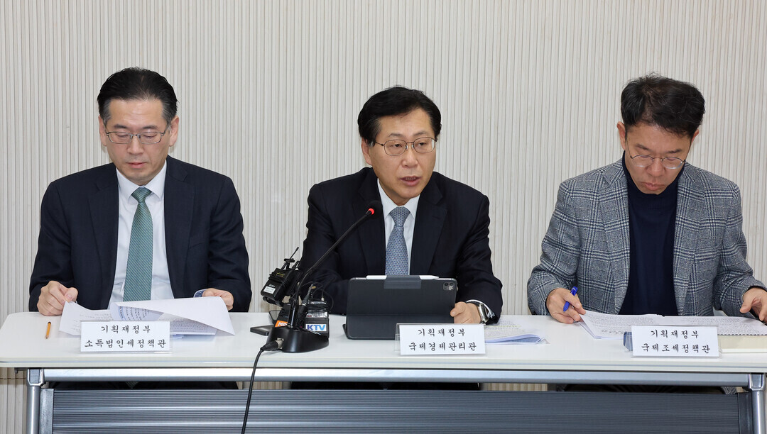 최지영 재정경제부 국제경제관리관(가운데)이 24일 정부세종청사 재경부 기자실에서 국내 투자 및 외환 안정 세제지원 방안에 관해 설명하고 있다. / 연합뉴스