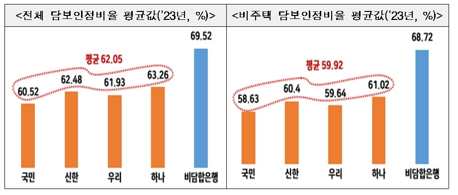 2023년을 기준으로 4개 은행의 담보인정비율 평균은 비담합은행에 비해 7.5%p 낮게 형성되었으며, 공장, 토지 등 기업대출과 연관성이 큰 비주택 부동산의 담보인정비율 평균은 차이가 더 큰 8.8%p로 나타났다.