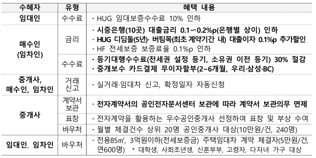 또한 실거래 신고와 확정일자가 자동 처리돼 관공서 방문이 필요 없으며, 계약서는 공인전자문서센터에 보관돼 중개사의 종이계약서 보관 의무도 면제된다. 금융 혜택도 크다. 매수인과 임차인은 대출 시 0.1~0.2%p 금리 인하를 받을 수 있고, 등기대행수수료와 임대보증수수료 절감 효과도 누릴 수 있다.