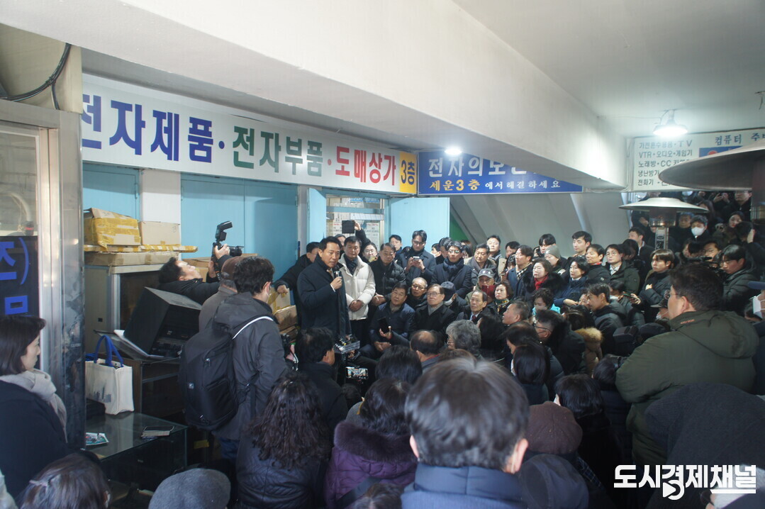 세운상가 3층 입구에서 열린 주민간담회에는 100여명의 상인과 주민이 참석했다.