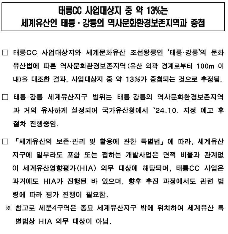 그러나 서울시는 다음 날(30일) 배포한 설명자료에서 “태릉CC 사업대상지 중 약 13%가 조선왕릉 태릉·강릉의 역사문화환경보존지역과 중첩된다”며 비판에 나섰다. 서울시는 세계유산 특별법에 따라 해당 사업이 세계유산영향평가(HIA) 의무 대상이라고 강조했지만, 이는 이미 정부 발표자료에 포함된 내용이었다.