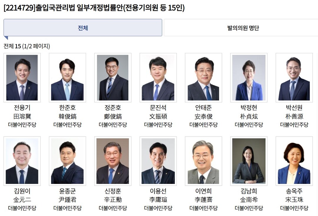 전세사기범 해외도주 방지법은 전용기 의원이 대표 발의하고, 한준호, 정준호, 문진석, 안태준 등 15인의 의원이 참여하였다. /국회 의안정보시스템 화면 갈무리