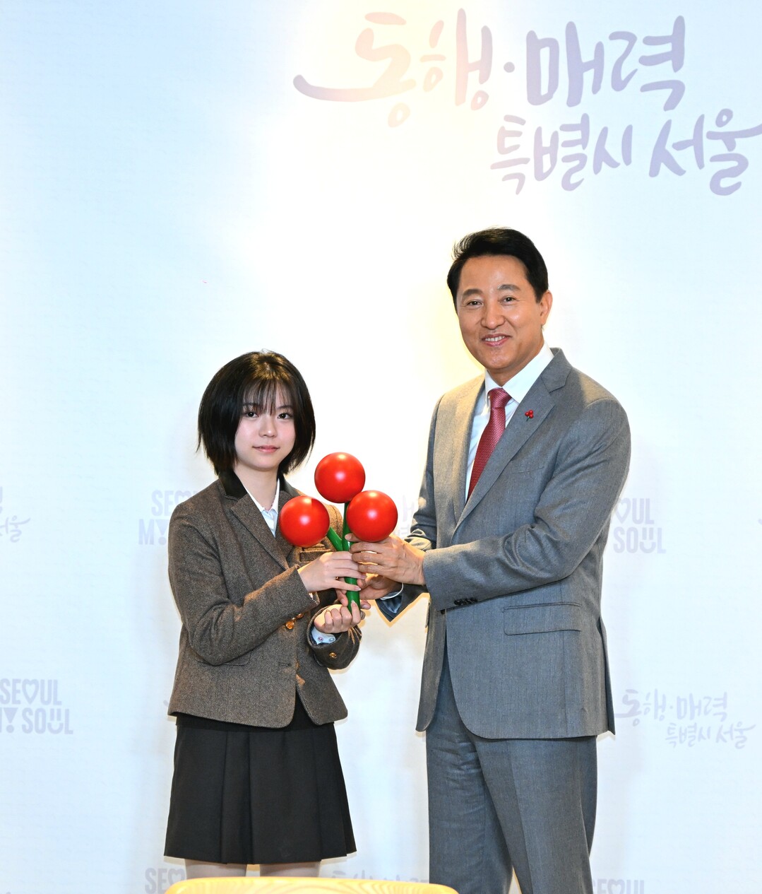 사랑의 열매 온도탑 점등 행사에 참여한 오세훈 서울시장, 백은별 씨(17세, 맨 아래 사진)와 함께 사랑의열매 전달식도 진행됐다. /서울시 제공