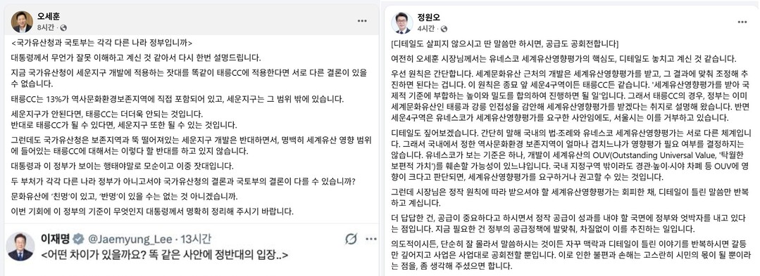 두 후보의 충돌은 정부가 29일 발표한 ‘수도권 6만호 공급대책’ 중 태릉CC 개발 방침을 계기로 불거졌다. 오 시장은 태릉CC가 세계유산 영향 범위에 포함된 만큼 개발이 부적절하다고 주장하며, 세운지구와의 형평성 문제를 제기했다. 반면 정 후보는 공급의 실효성을 강조하며 “정부 정책에 발맞춰 차질 없이 추진해야 한다”고 강조했다.